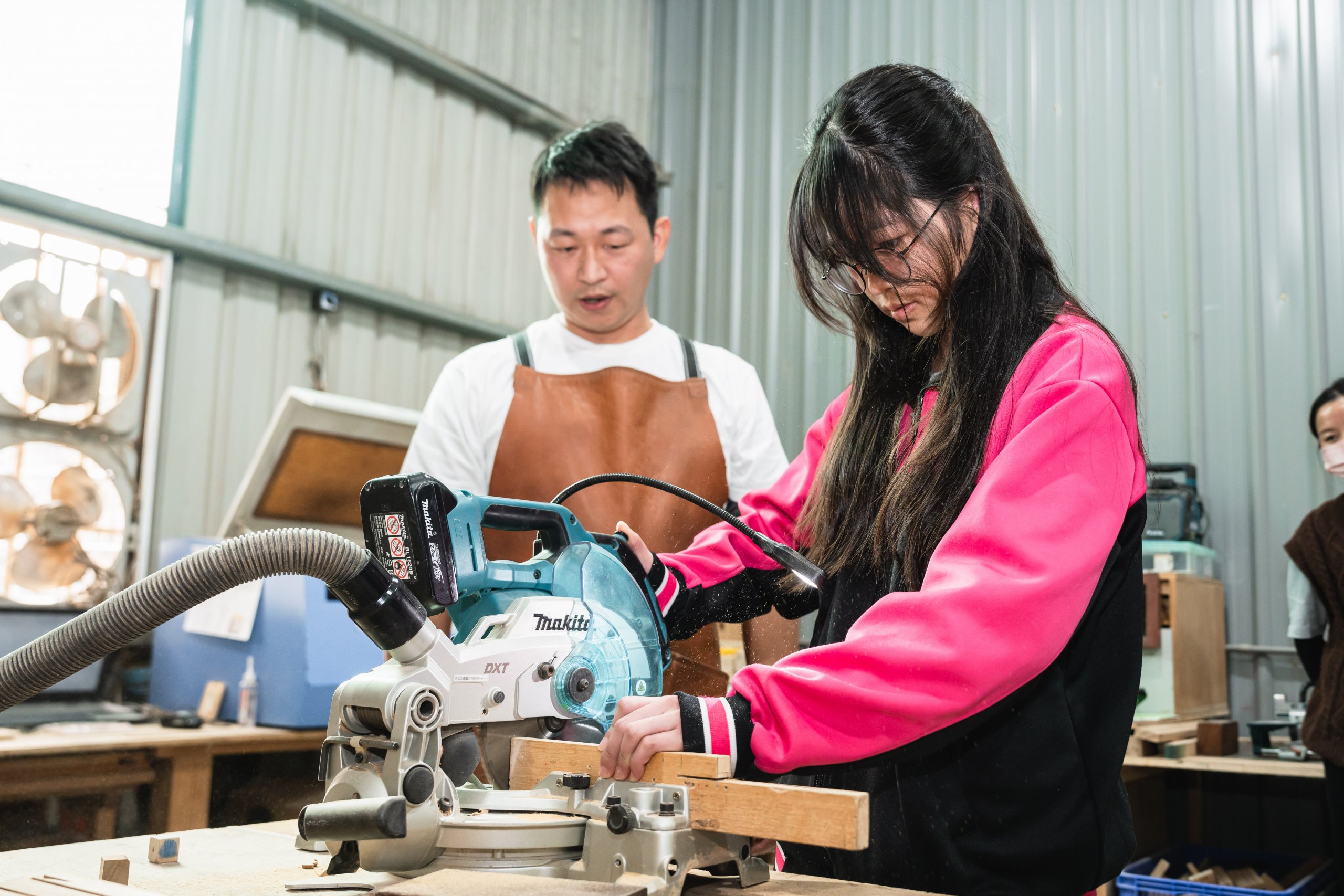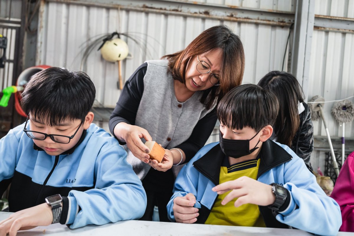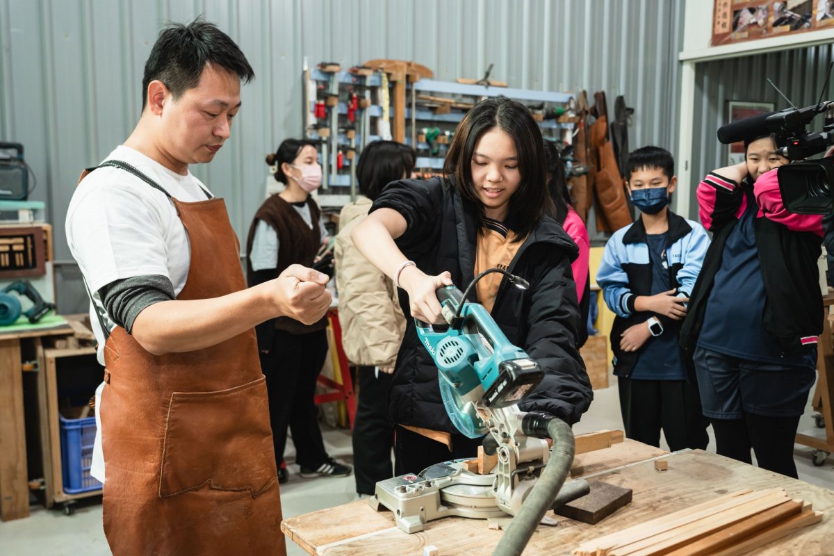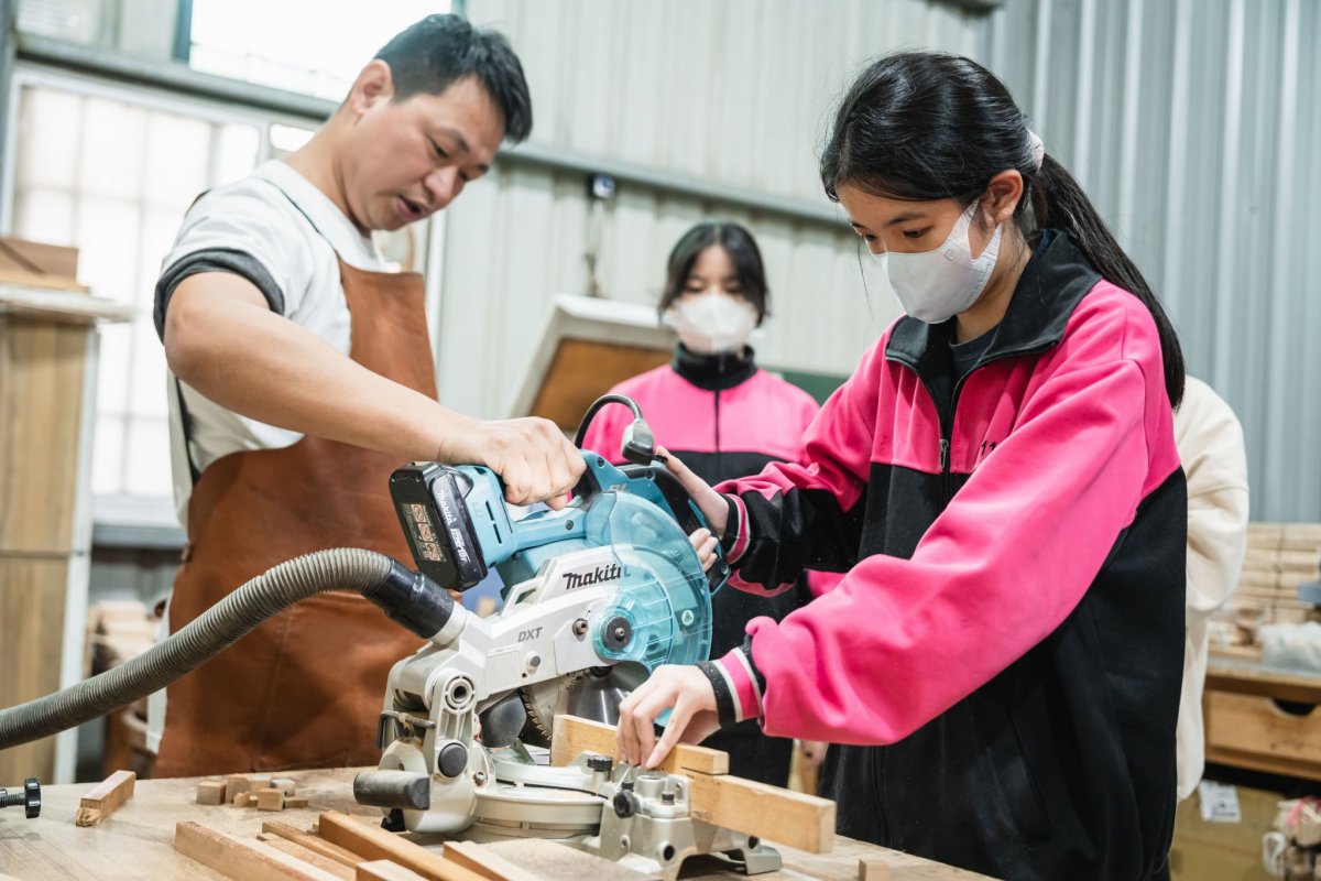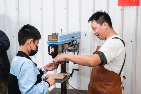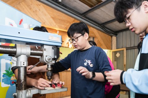 達人也親自傳遞木工工作室的魅力之處,說明排列有序的工具牆,能幫助他流暢順手的將用具歸位;放置機台的工作桌則帶有輪子,可任意規劃使用機器的動線。接著,達人如數家珍的介紹車床、帶鋸機和雷射雕刻機等可靠的機器夥伴,並讓同學們體驗操作「切斷器」,切割長條狀的木頭;裁切好的木塊,再以虎鉗固定擺放位置,讓「鑽床」的旋轉鑽頭能精準鑽孔。由於是首次接觸木作器材,有些同學難掩激動,伴隨器械運轉的聲響,流露出既興奮又害怕的神情;也有同學即使動作帶有一絲生疏,仍冷靜從容的依照達人指示,學會如何安全的發動機器、執行作業,重複這兩項不可或缺的基礎工序。