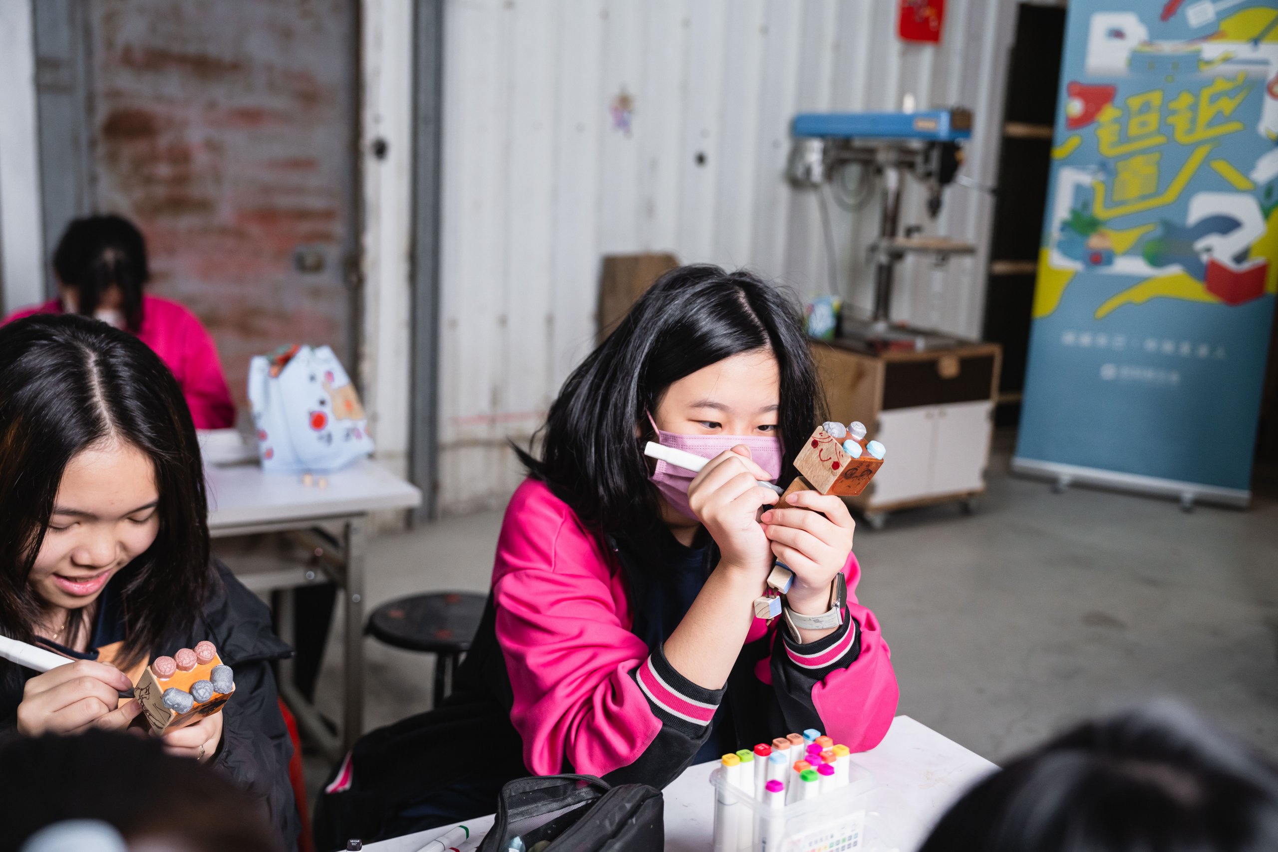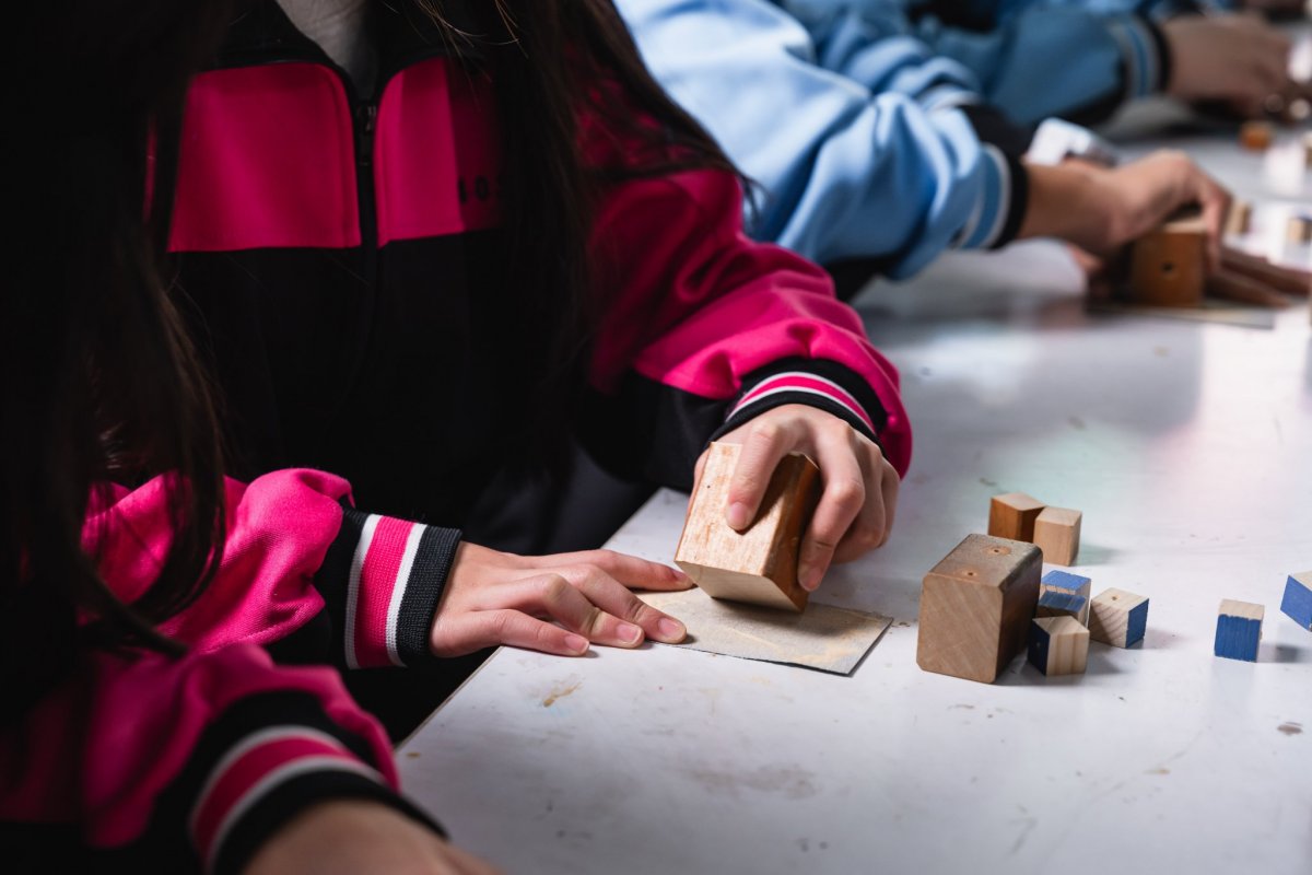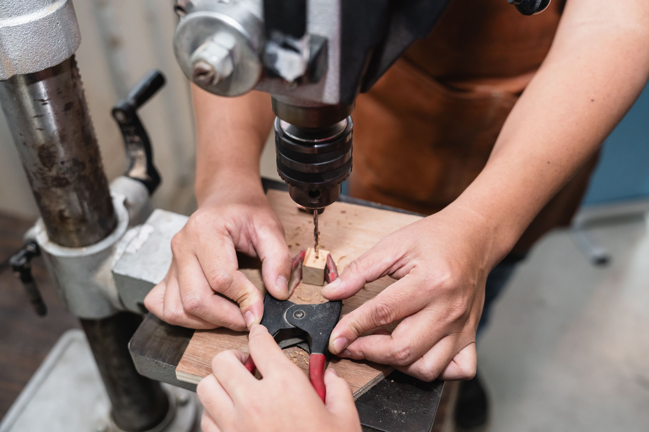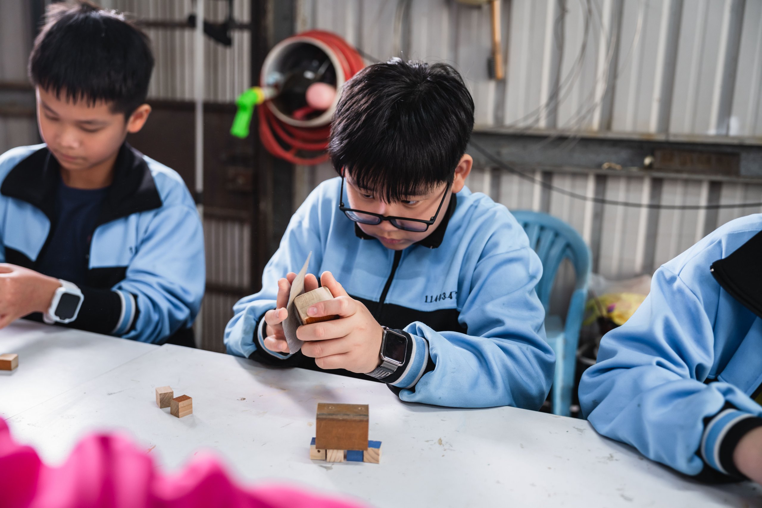 達人也親自傳遞木工工作室的魅力之處,說明排列有序的工具牆,能幫助他流暢順手的將用具歸位;放置機台的工作桌則帶有輪子,可任意規劃使用機器的動線。接著,達人如數家珍的介紹車床、帶鋸機和雷射雕刻機等可靠的機器夥伴,並讓同學們體驗操作「切斷器」,切割長條狀的木頭;裁切好的木塊,再以虎鉗固定擺放位置,讓「鑽床」的旋轉鑽頭能精準鑽孔。由於是首次接觸木作器材,有些同學難掩激動,伴隨器械運轉的聲響,流露出既興奮又害怕的神情;也有同學即使動作帶有一絲生疏,仍冷靜從容的依照達人指示,學會如何安全的發動機器、執行作業,重複這兩項不可或缺的基礎工序。