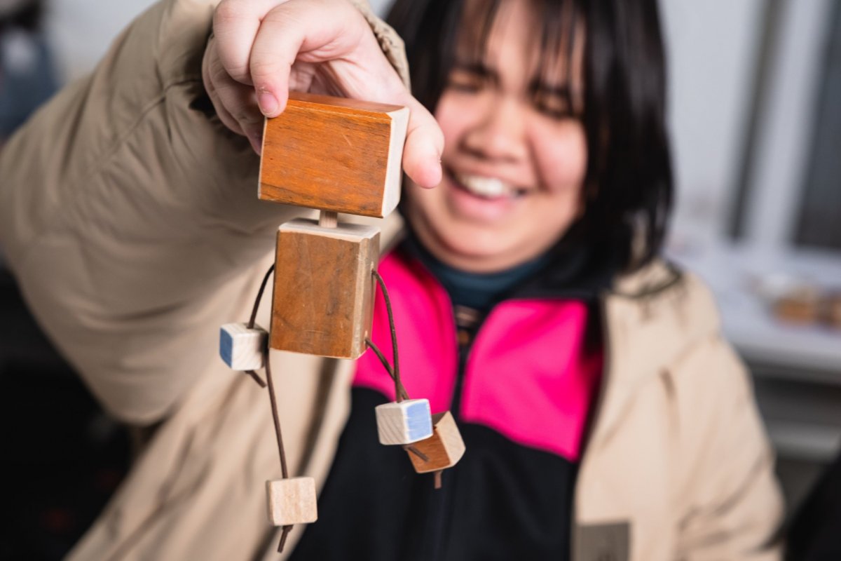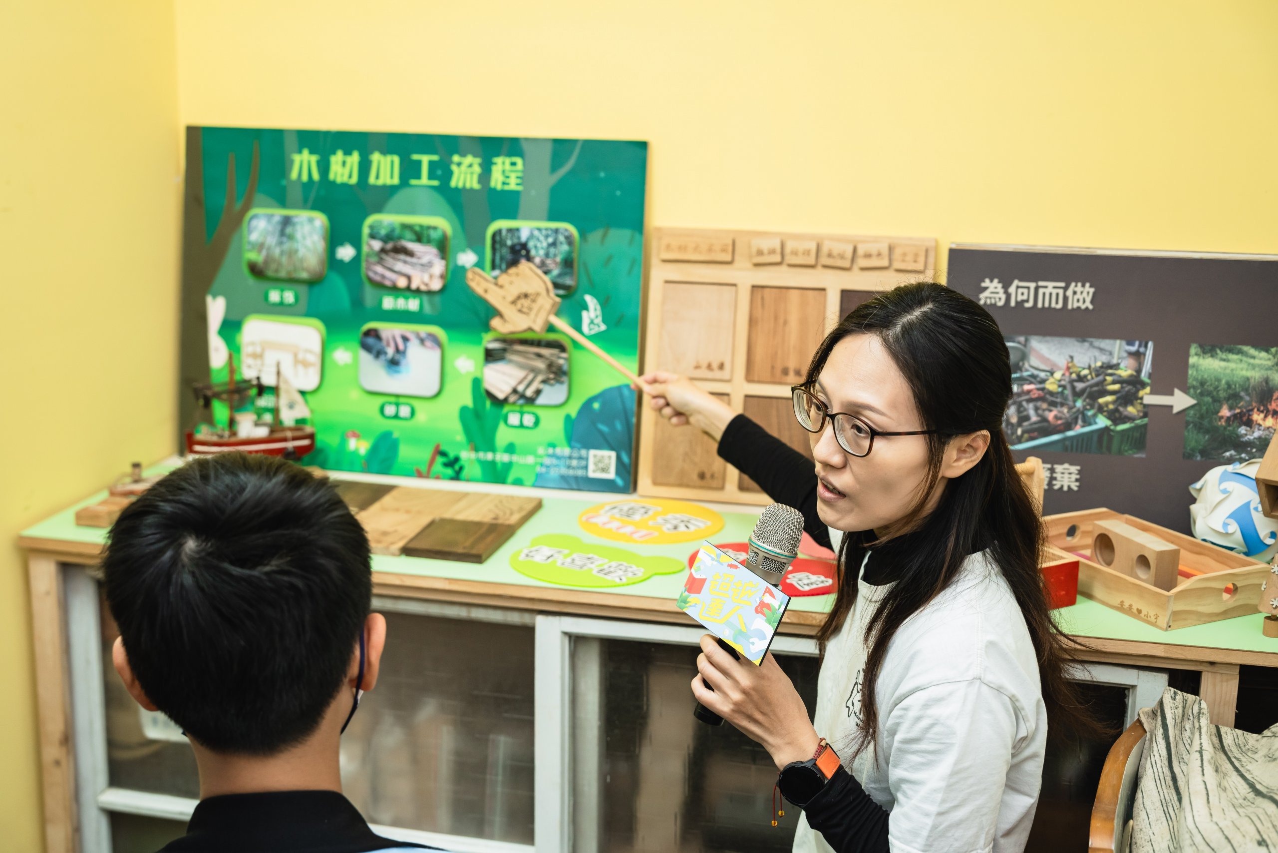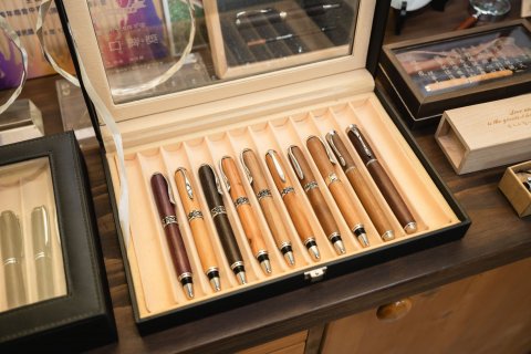 當天由「沁木手作」的Emma老師為同學們帶來詳盡的解說導覽,從木作源頭的「樹」開始,能拿起達人先前裁切的木片,比較不同木材的紋理、色澤和重量,再輪流聞看看樟樹和紅檜木塊,享受清新醒腦與溫暖療癒的獨特芬芳。走訪一圈展示區,除了達人匠心獨具的招牌手工筆,也觀賞到親子DIY活動所製作的提盒和椅凳,以及領結、手機架、感謝狀等豐富多元的木製品。不論是閱歷豐富的成人或是探索世界的孩童,都有機會從富含溫度的木工實作中,領會珍惜自然界寶貴資源的真諦。