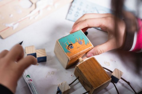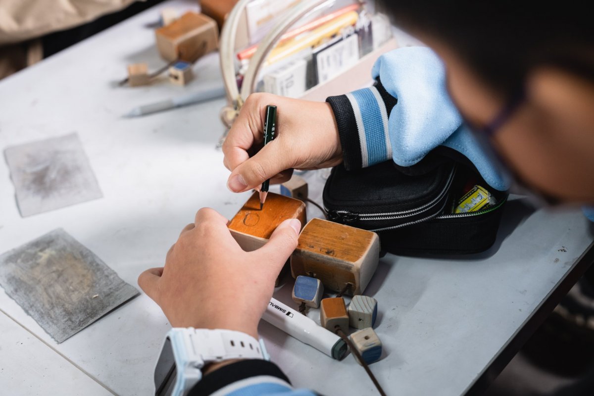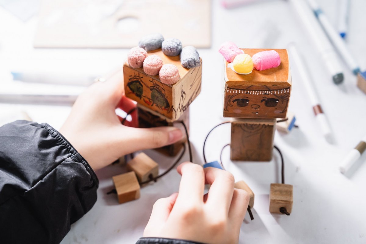難得與木工達人面對面,可不能錯過體驗DIY的大好機會!發下木頭、木釘和皮繩三項主要材料後,達人簡明扼要的示範用砂紙打磨木頭的技巧,能按照自己的偏好,磨出理想的平滑表面或圓弧角度,同學們一抓到訣竅,便越磨越起勁,一桌的木屑皆是全心投入的證明。到了組裝環節,能以木槌輔助,讓木釘銜接機器人的頭部和身體,自己剛剛裁切、鑽孔的木塊則可裝飾外觀,或是穿過皮繩作為手腳。