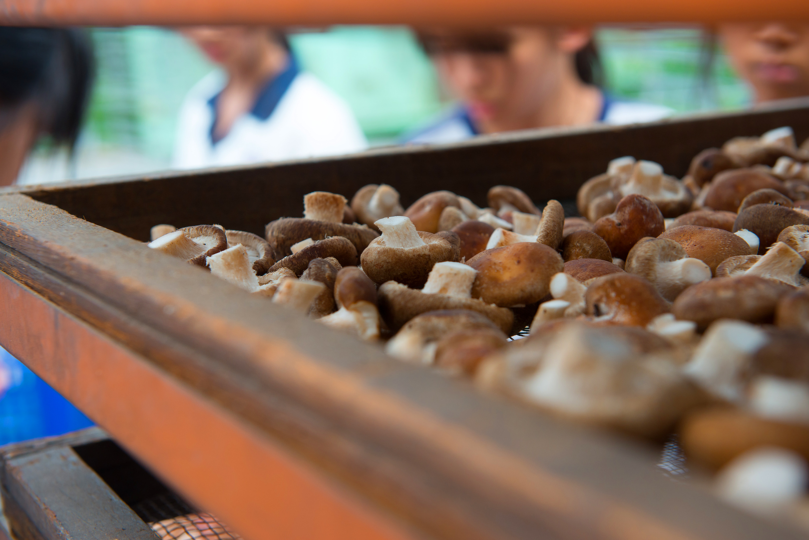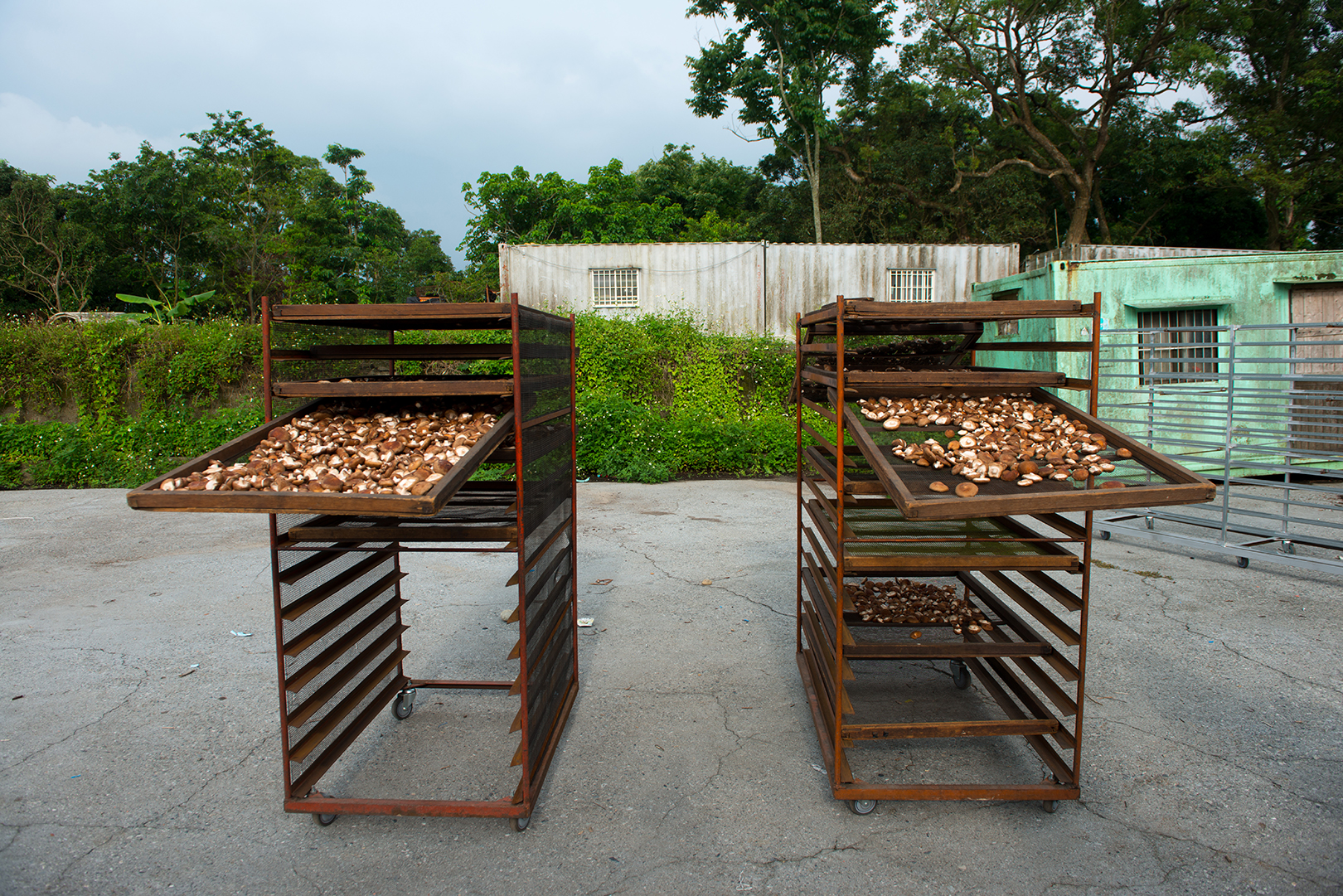 走進賴媽媽香菇園,在一大塊的空地上,會看見一籃又一籃的曬網,上面則曬著一朵又一朵的香菇,其實賴媽媽香菇最令人津津樂道的,是他們的香菇一律採用「日曬」。